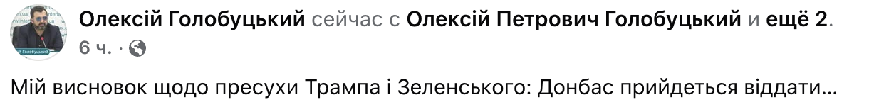 Український політолог Олексій Голобуцький досить коротко та влучно підвів підсумки цієї зустрічі: "Мій висновок щодо пресухи Трампа і Зеленського: Донбас прийдеться віддати…"