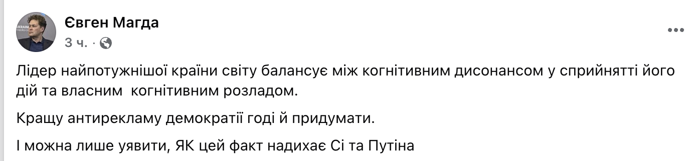 Український політолог Євген Магда наголосив: "Лідер найпотужнішої країни світу балансує між когнітивним дисонансом у сприйнятті його дій та власним когнітивним розладом. Кращу антирекламу демократії годі й придумати. І можна лише уявити, ЯК цей факт надихає Сі та Путіна".