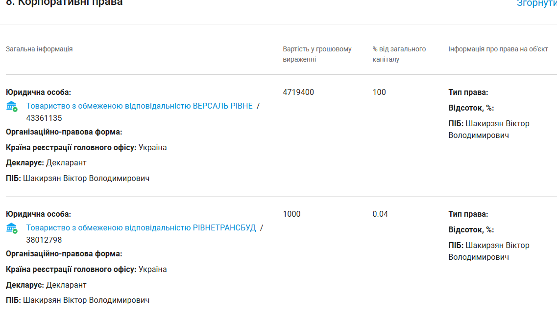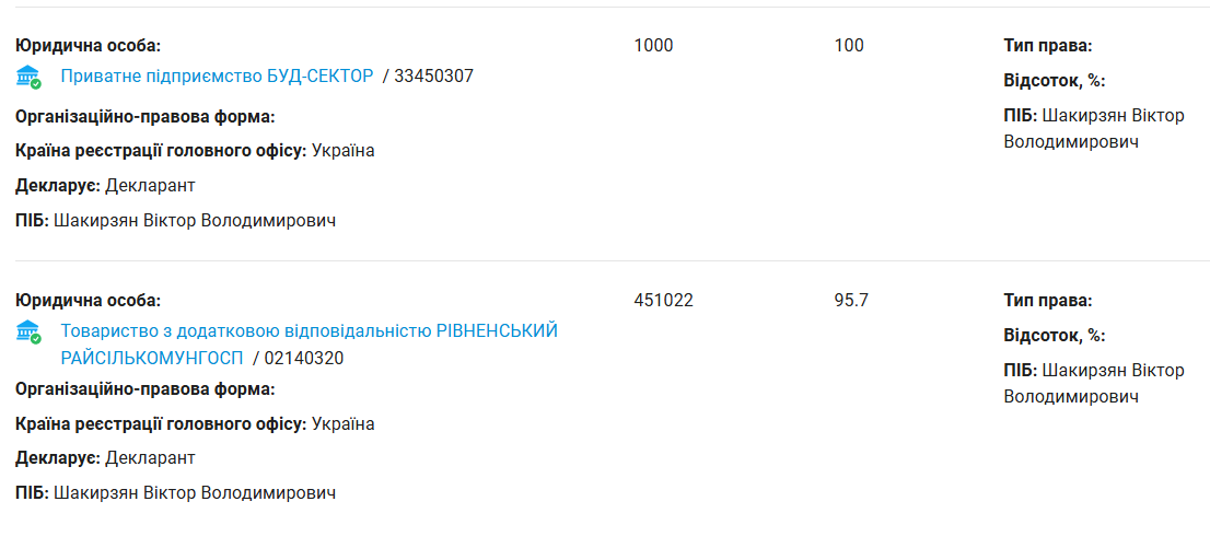 Що стосується бізнесу, то Шакирзяну повністю належать: Товариство з обмеженою відповідальністю "ВЕРСАЛЬ РІВНЕ" та Приватне підприємство "БУД-СЕКТОР", 95,7% Товариства з додатковою відповідальністю "РІВНЕНСЬКИЙ РАЙСІЛЬКОМУНГОСП" та 0,04% Товариства з обмеженою відповідальністю "РІВНЕТРАНСБУД". Варто зазначити, що іномарки, якими користується секретар міськради, та ще деяка нерухомість офіційно належить компаніям, в яких він їх нібито орендує.