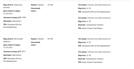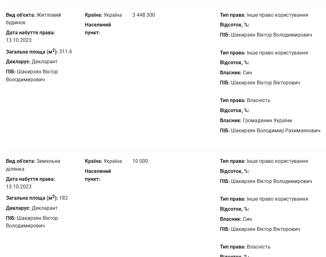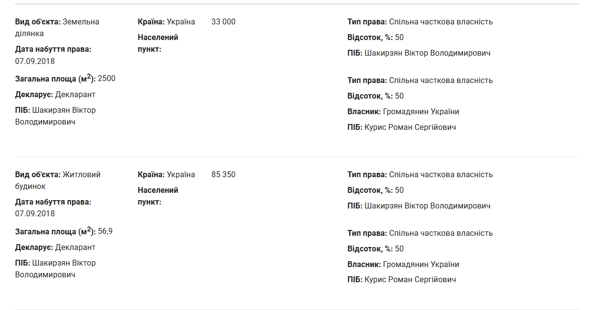 В декларації за 2024 рік Шакирзян показав, що є власником наступної нерухомості. 50% земельної ділянки площею 25 соток, що вартувала на момент придбання у 2018 році 33 тисячі гривень, та половина житлового будинку на 56,9 квадрата, який судячи з усього, стоїть на вказаній ділянці. Він вартував у тому ж 2018-му 85 350 гривень. Інші 50% будинку та землі належать Роману Курису.