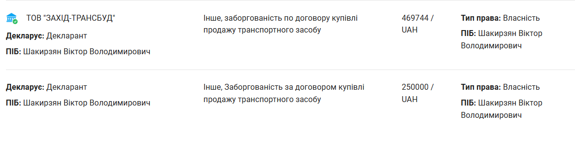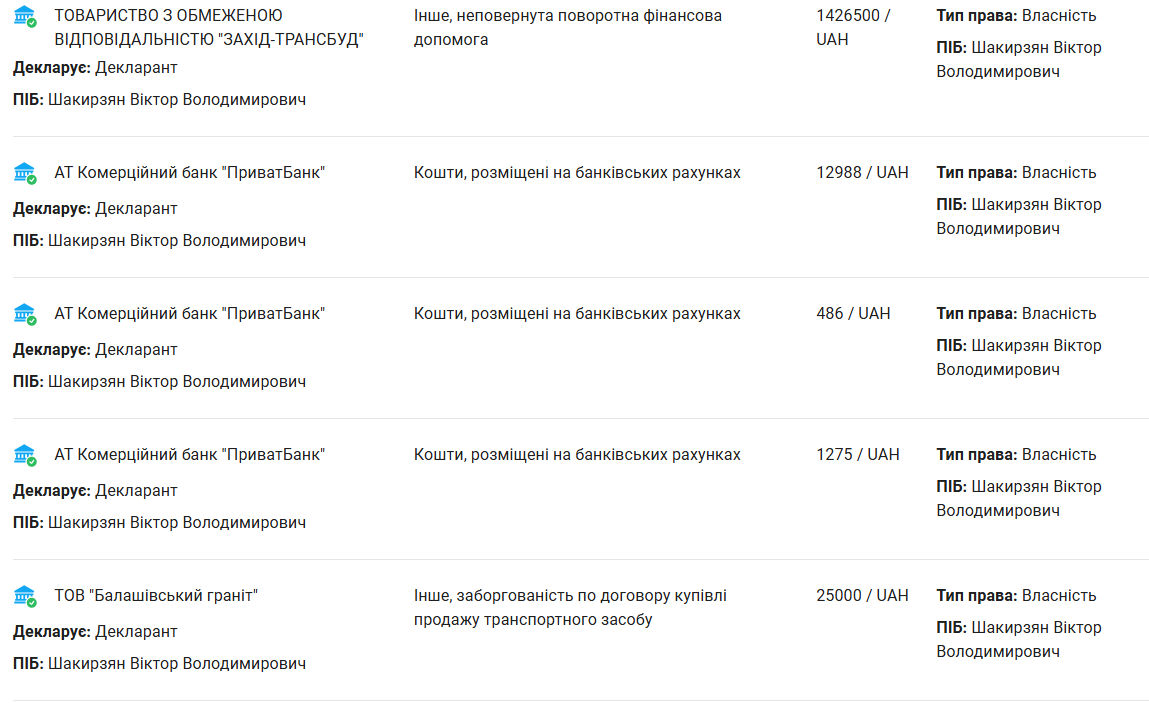 Цікаво, що найбільшим доходом Віктора Шакирзяна за 2024 рік опинився негрошовий подарунок від батька, що вартує 1 267 046 гривень. Судячи з суми та дати можна припустити, що це той самий будинок загальною площею понад 100 квадратів із земельною ділянкою.