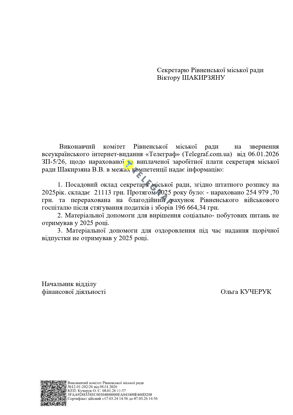 Про це повідомили в мерії Рівного у відповідь на запит "Телеграфу". Посадовий оклад секретаря міськради Віктора Шакирзяна протягом минулого року становив 21 113 гривень. Для порівняння, середня зарплата в Україні у листопаді 2025 року склала 27 167 грн.