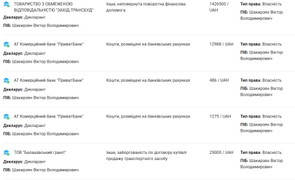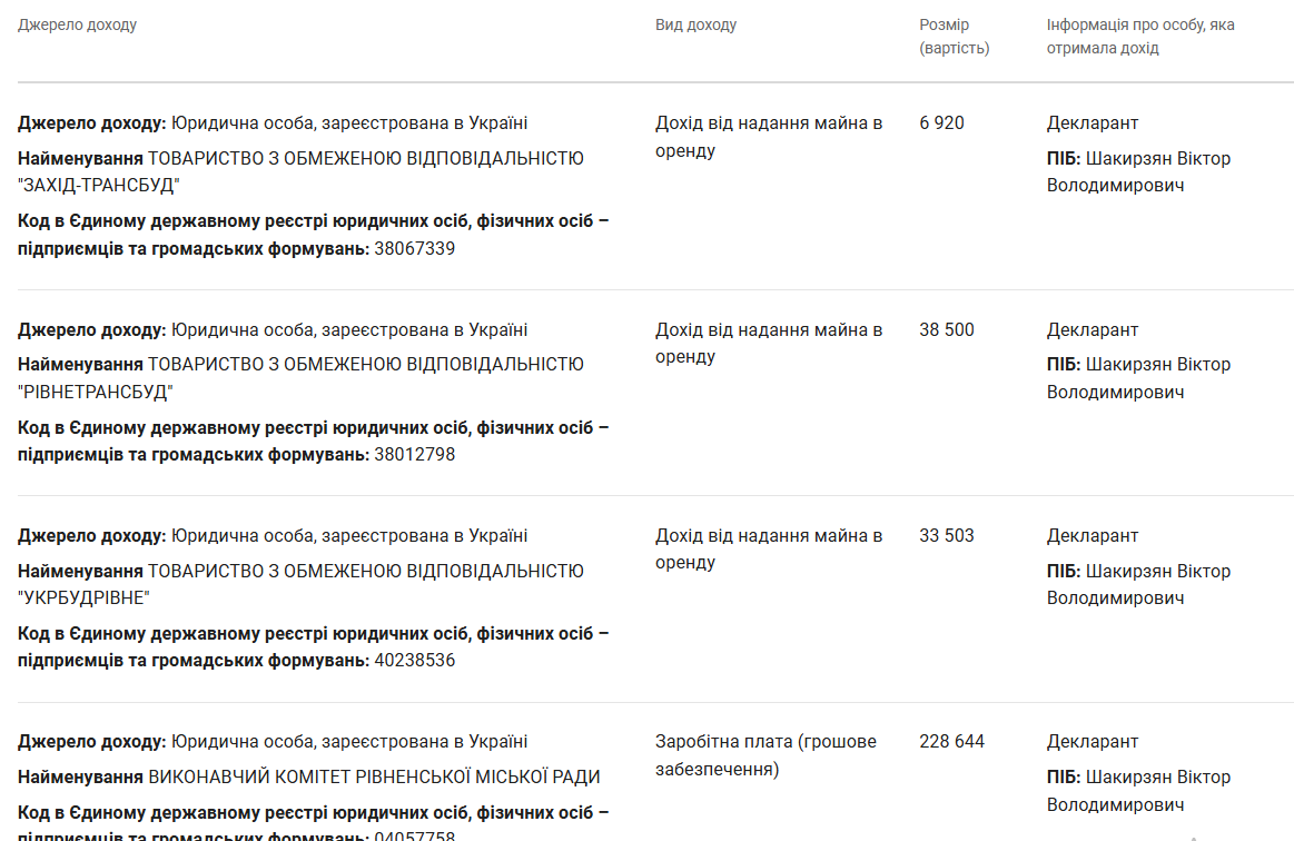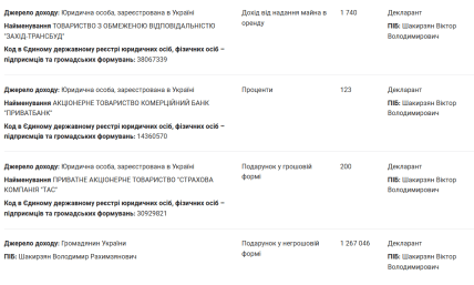 На другому місці за доходами – зарплата за рік на посту секретаря міськради у сумі 228 644 гривень. Також Шакирзян отримав загальний дохід від надання майна в оренду у сумі 80 663 гривень, та 123 гривень відсотків від вкладу у "Приватбанк".