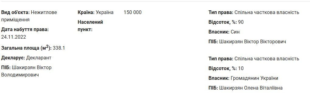 Але привертає увагу нежитлове приміщення площею понад 300 квадратів, придбане Віктором Вікторовичем наприкінці 2022 року за 150 тисяч гривень. 10 відсотків будівлі належить Шакирзян Олені Віталіївні – скоріше за все, дружині.