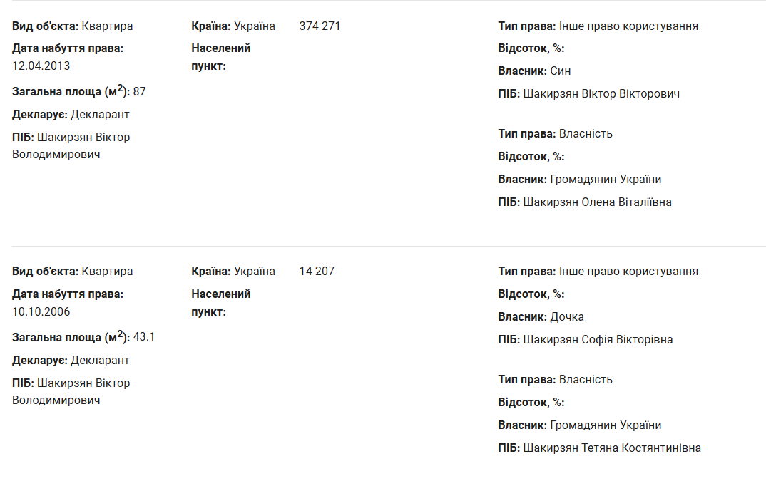 Віктор Шахирзян також задекларував квартири, що належать дочці Софії та синові Віктору, куплені багато років тому.