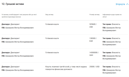 Посадовець задекларував збереження у готівці у розмірі 529 600 доларів США, 138 300 євро та 14 300 000 грн. Хоча він надає перевагу старим добрим паперовим грошам, все ж на момент декларування у Шакирзяна зберігалося у на трьох різних рахунках "Приватбанку" 14 749 гривень.