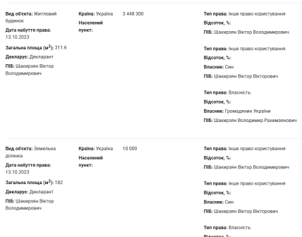 Журналісти-розслідувачи видання "Четверта влада" докопалися, що у декларації за 2022 рік будинок і ділянки вже перебували не у власності, а в користуванні Шакирзяна. Власником він указав Романа Балацького, який придбав будинок 27 серпня 2022 року.