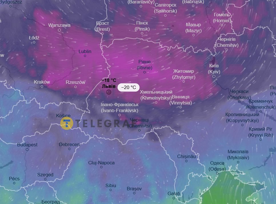 - Температура: вночі по області очікується 14-19° морозу, вдень — 8-13° нижче нуля. У Львові вночі термометри покажуть -15…-17°C, вдень — від -9°C до -11°C.