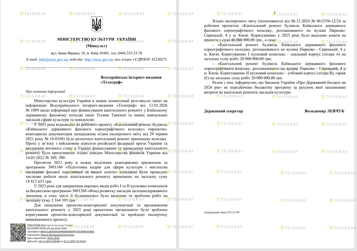 У відповіді на запит "Телеграфа" щодо капітального ремонту у Київському державному фаховому хореографічному коледжі імені Тетяни Таякіної загальною вартістю 225,29 млн грн, Мінкульт зазначив тільки, що процес ремонту було розпочато ще у 2021 році на підставі затвердженої проєктно-кошторисної документації.