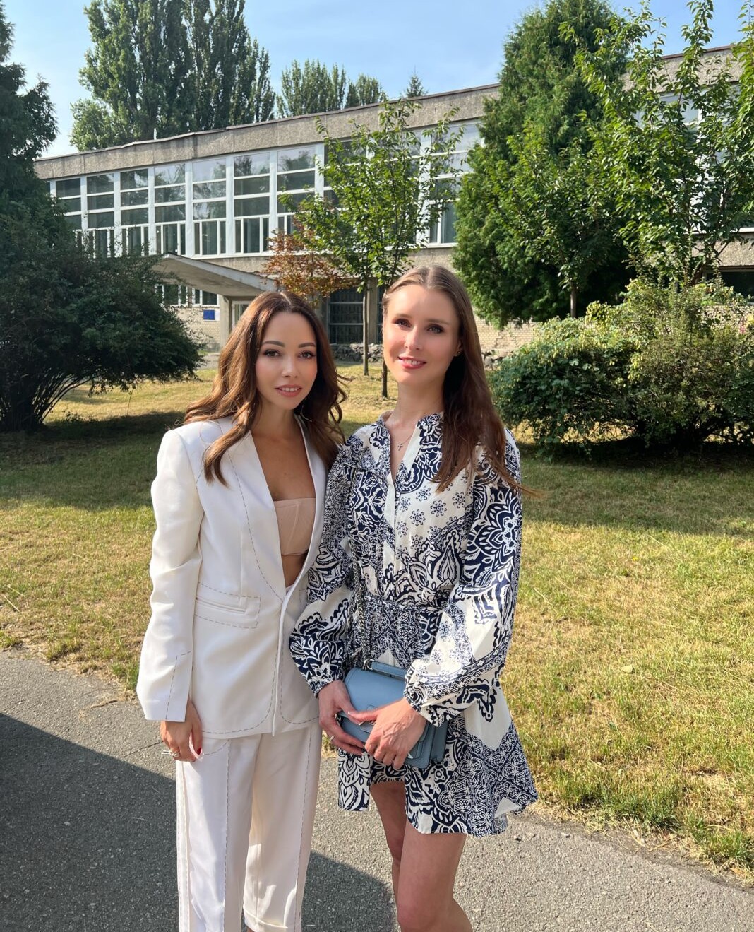 керівниця хореграфічного коледжу Катерина Кухар та солістка Національної опери України Ольга Голиця на фоні коледжу