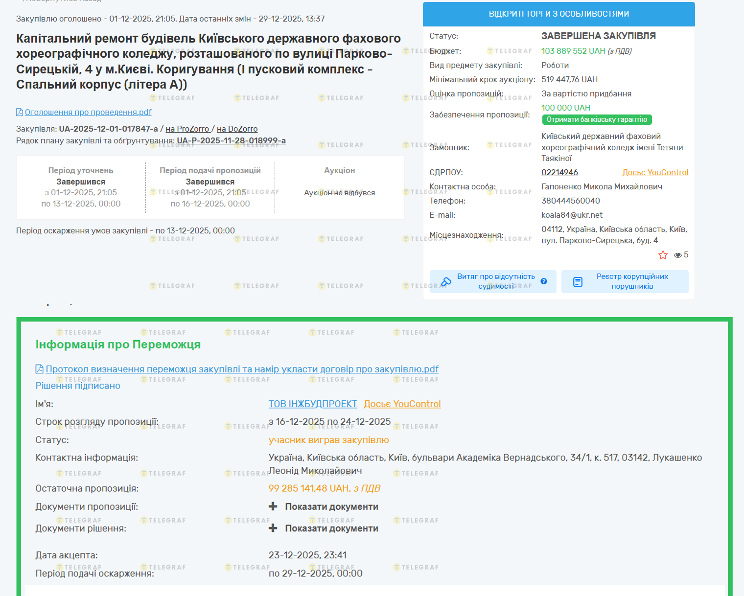 Сповіщення про моніторинг в системі Прозорро ремонту коледжа в Києві