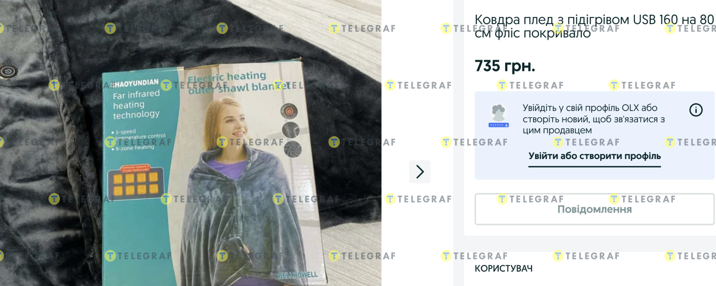 Ковдра з підігрівом. Її вартість становить 735 грн. Ковдра з підігрівом USB має розмір 160см*80 см. Її можна підключити до повербанка. Ковдра має 5 зон нагріву і 3 температурні режими: 35-60°С. Час роботи від павербанка до 8 годин.