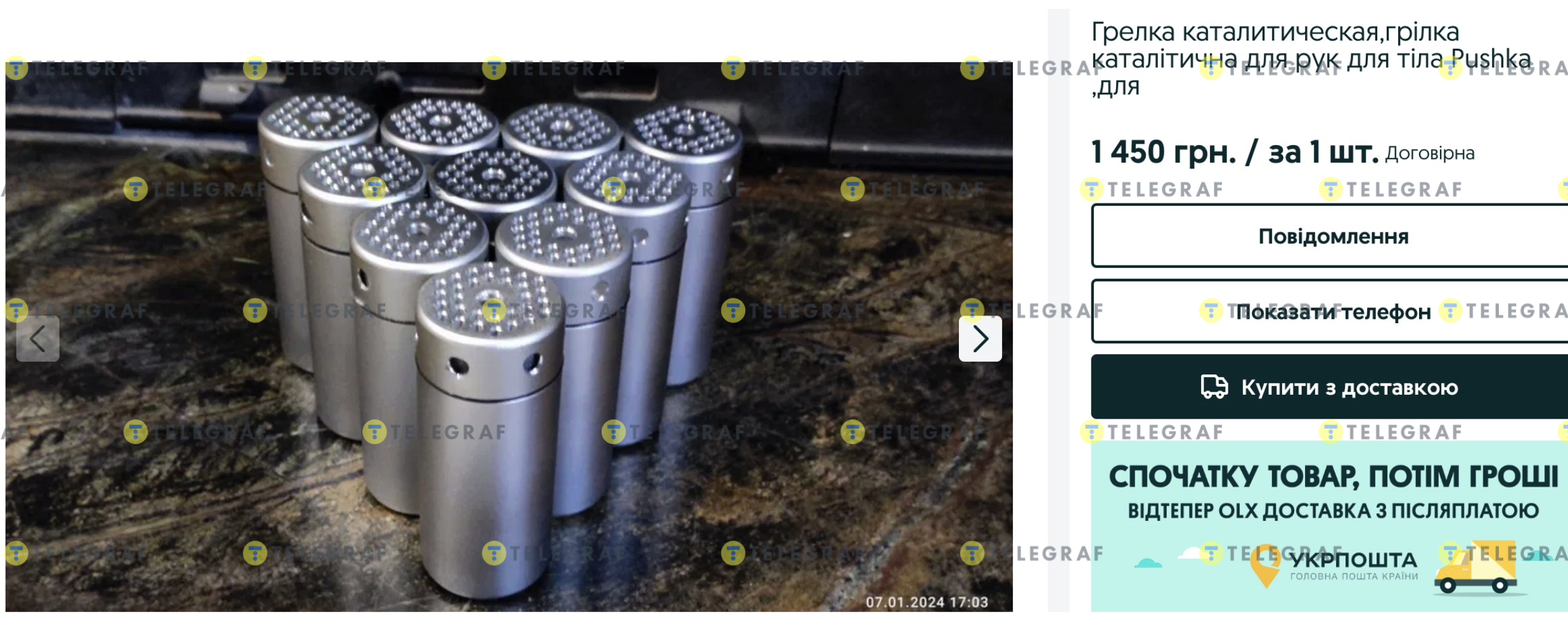 Каталітична грілка для рук — багаторазовий кишеньковий пристрій для обігріву, що працює на основі безполуменевого окислення парів очищеного бензину (або спирту). Вона видає до 60 °С, вага до 100 г. Вартість 1450 грн за 1 штуку.