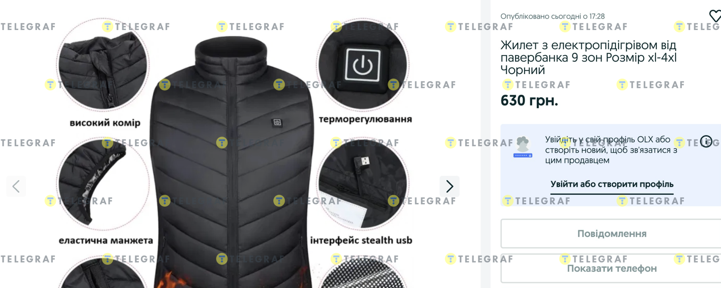 Жилет з підігрівом. Він також працює від повербанка, але має вже 9 зон нагрівання. Сім зон на спині і дві спереду. Продавець запевняє, що прогрівання рівномірне. Передбачено 3 рівні підігріву: 25°С, 35°С, 45°С. Розміри від XL до 4XL.