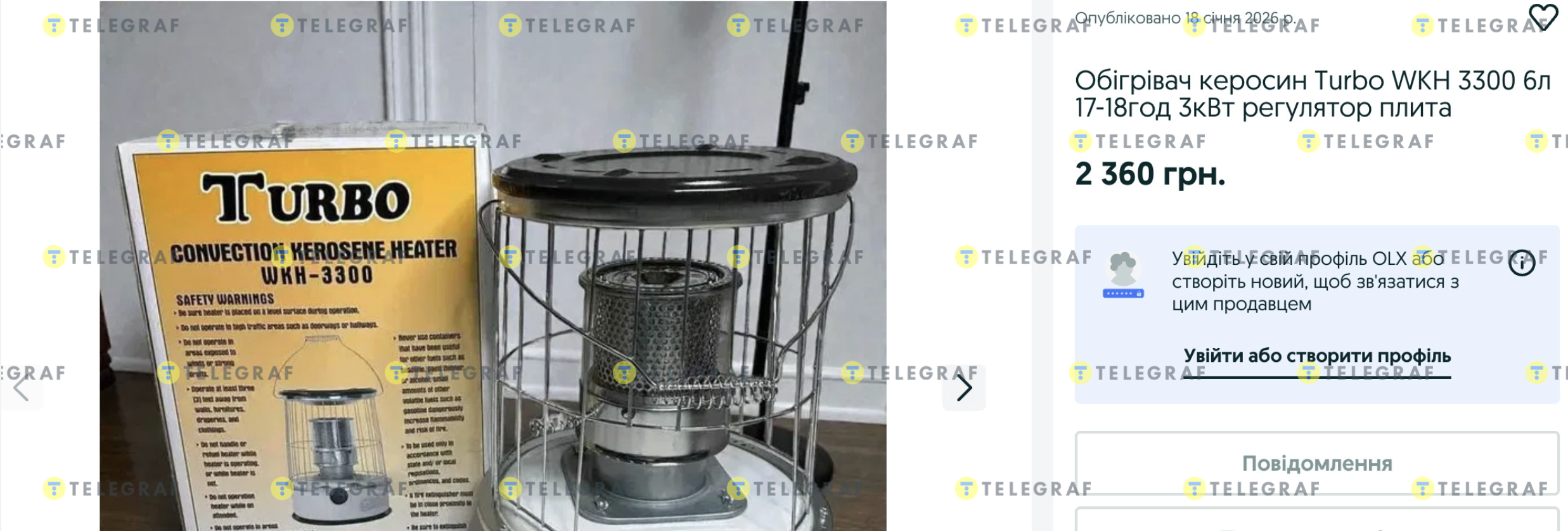 Гасовий обігрівач продають за 2 360 грн. Цей автономний обігрівач на гасі пдходить для підігріву їжі та опалення кімнати. Має регулятор температри, але під час його використання слід провітрювати кімнату.