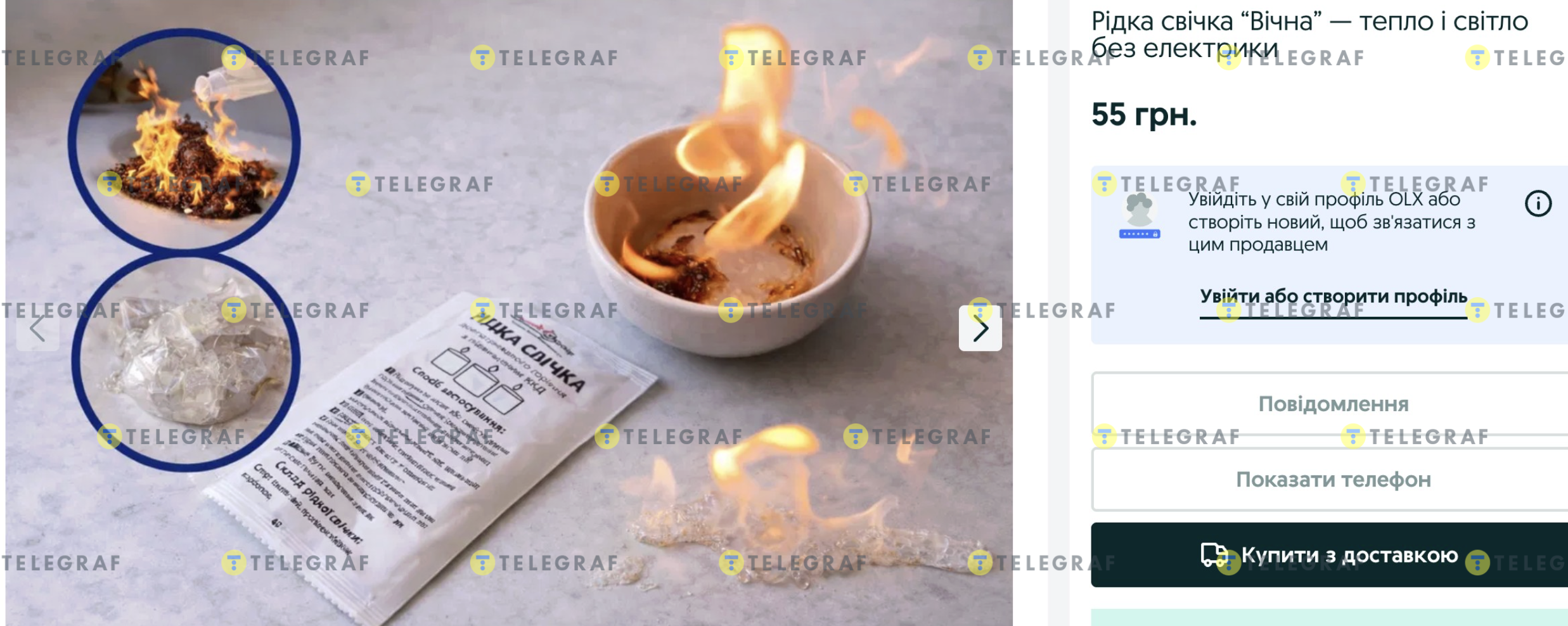 Рідка свічка — це безпечний горючий гель на основі спирту або інших компонентів, упакований у герметичні саше. Його треба засипати у спеціальну ємність та підпалити. Зазначається, що з допомогою свічки можна опалювати кімнати невеликого розміру, гріти до 60 літрів їжі та освітлювати кімнату. Вартість однієї свічки 55 грн.