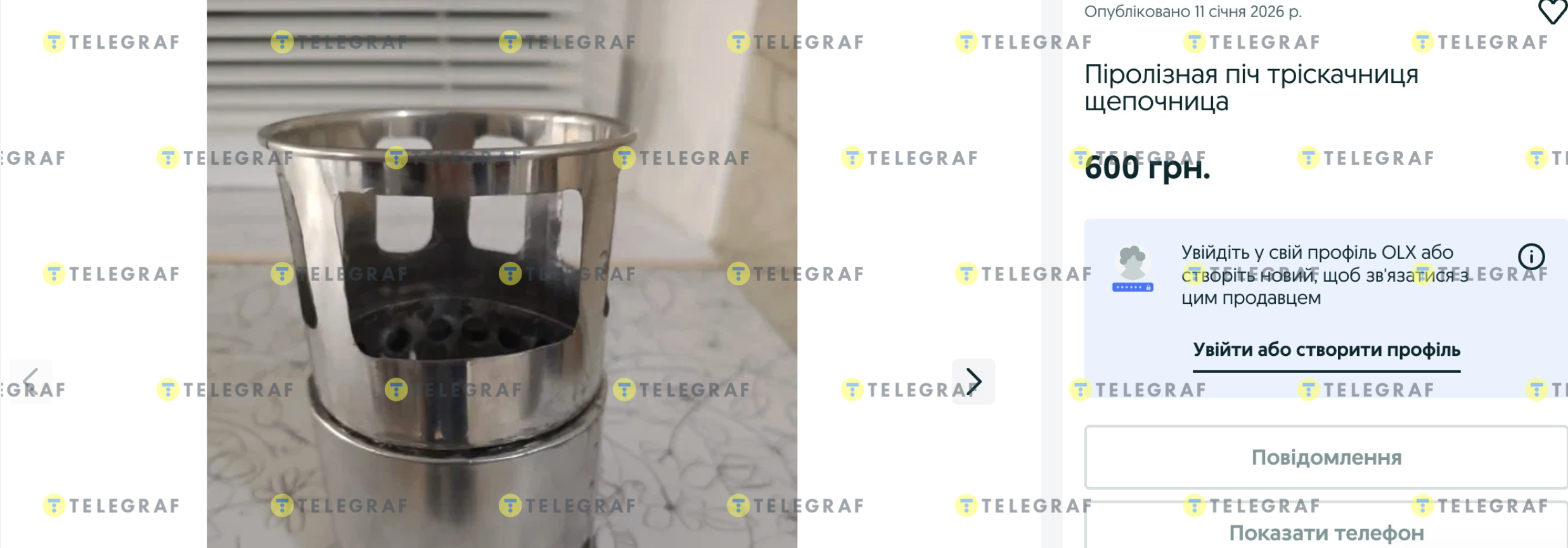 Піролізна піч-трісочниця — компактний, зазвичай розбірний похідний пристрій для приготування їжі, що використовує дрібні дрова (тріски, гілки) як паливо. Піч зроблена з нержавіючої сталі. Вартість 600 грн штука.