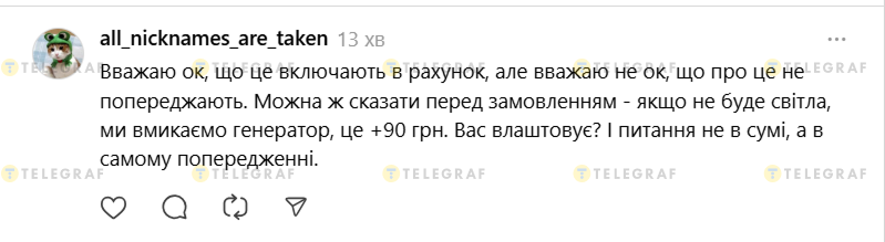 - Вважаю ок, що це включають в рахунок, але вважаю не ок, що про це не попереджають. Можна ж сказати перед замовленням — якщо не буде світла, ми вмикаємо генератор, це +90 грн. Вас влаштовує? І питання не в сумі, а в самому попередженні.