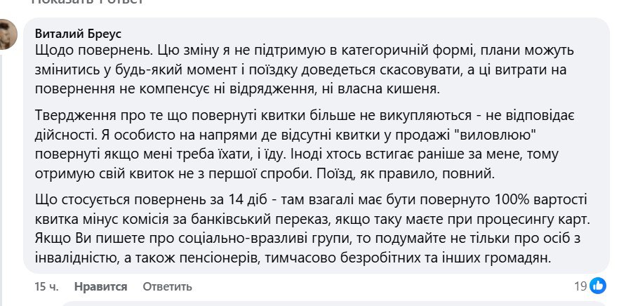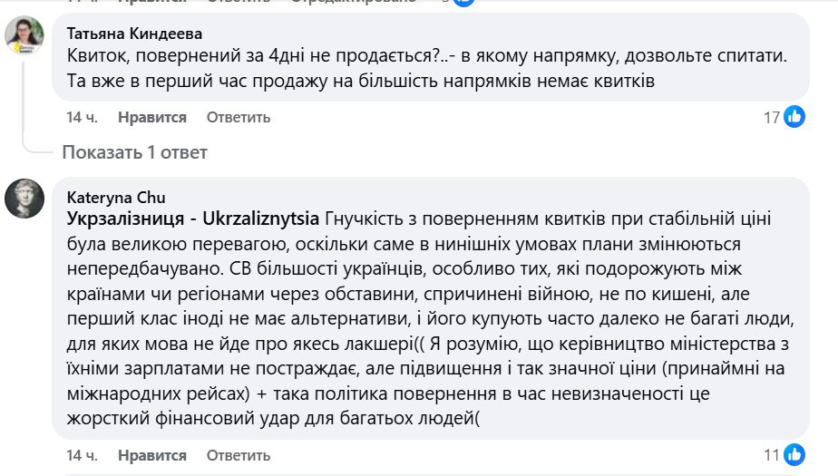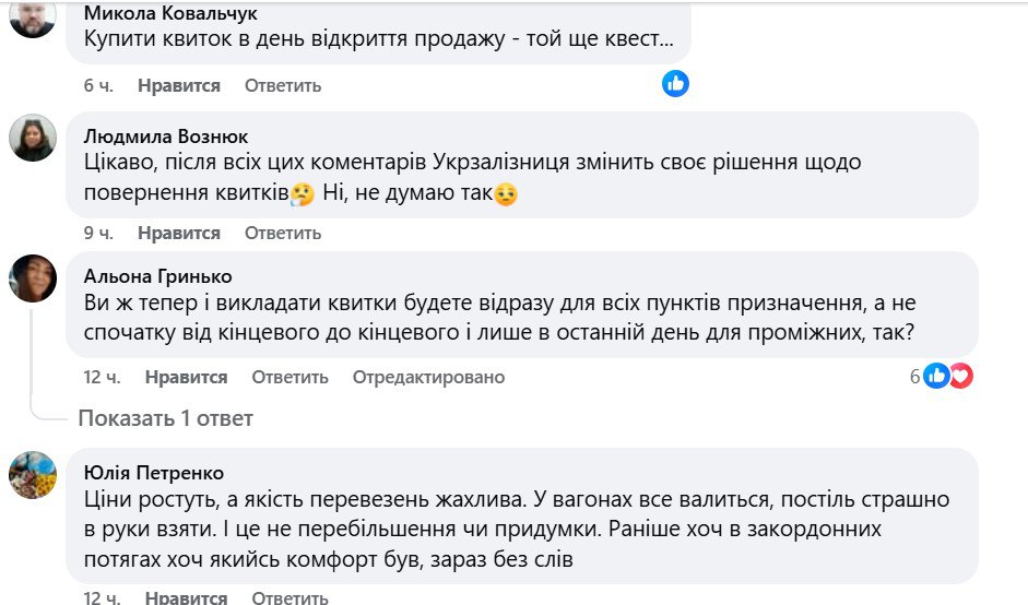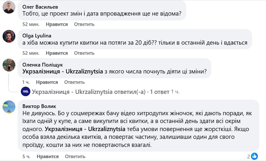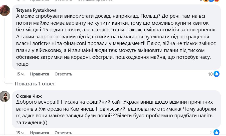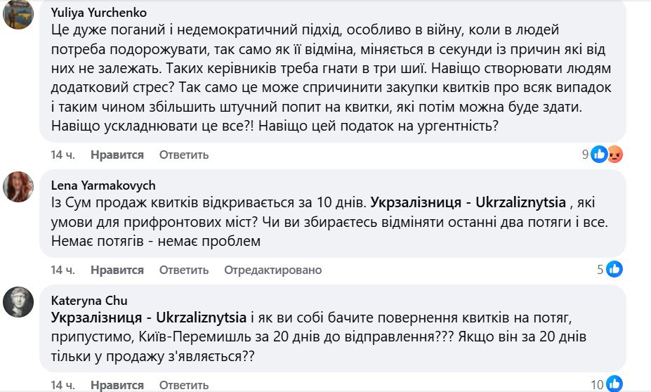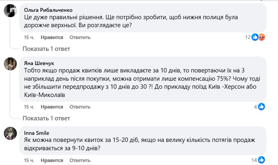 В коментарях під постом "Укрзалізниці" на Facebook вже під сотню коментарів і більшість з них критичні. От на які моменти звертають увагу дописувачі. По-перше, це прив’язка суми за повернення квитків до дати – чим раніше, тим більше. З одного боку, українці акцентують увагу, що прогнозувати, чи не зміняться плани на поїздку за 15-20 днів важко, адже ситуація через обстріли змінюється дуже динамічно. З іншого, говорять про те, що за 20 днів тільки відкривається продаж квитків.
