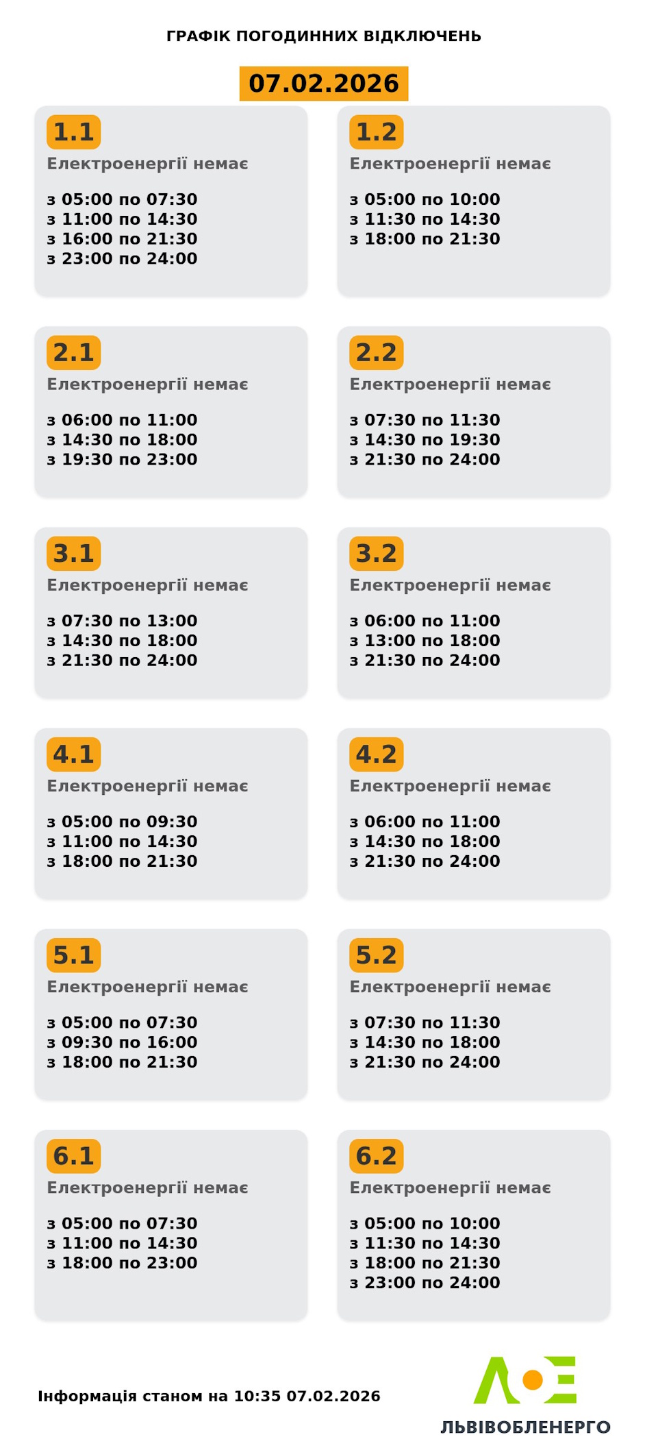Вночі та зранку у суботу, 7 лютого, росіяни завдали нових ударів по енергетичних об'єктах України у восьми областях. Внаслідок ударів в енергосистемі суттєво збільшився дефіцит потужності, в усіх регіонах збільшили тривалість відключень, у більшості областей також діють аварійні відключення. Попередньо оприлюднені графіки не діють.