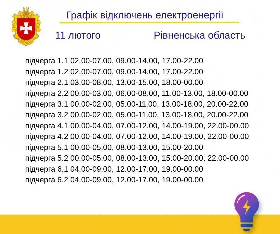 Графіки відключень в Рівненській області 11 лютого