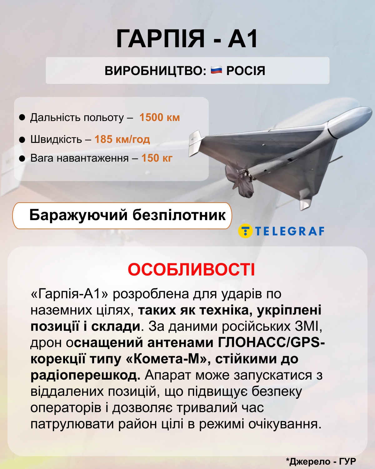 Ще в 2024 році в РФ почали виробляти новий ударний дрон великої дальності "Гарпія А-1". На нього встановлювали китайський двигун та збирали в Іжевську. Вони дуже схожі на "шахеди", але мають певну відмінність. Окрім двигуна це система "Комета".