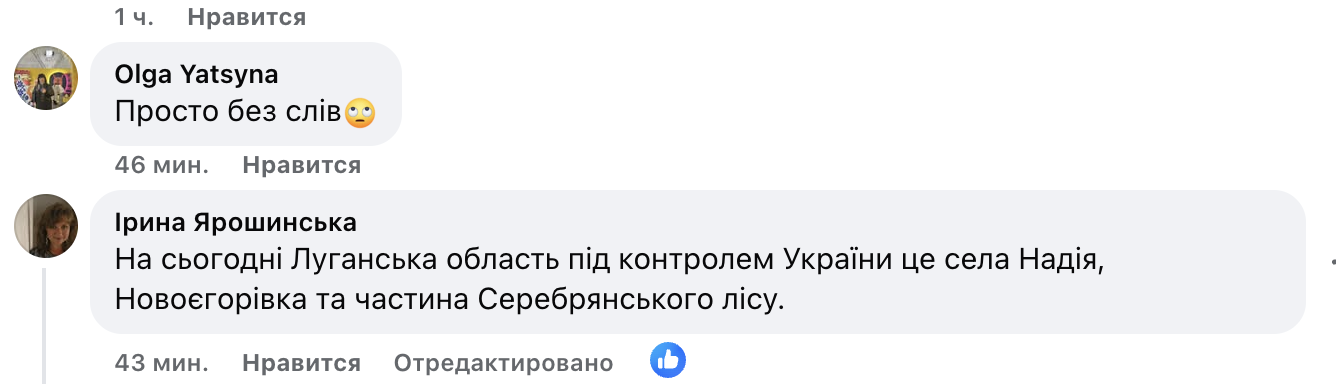 Люди в коментарях також розділили думку військового, наголосивши, що є два села під контролем ЗСУ — Надія, Новоєгорівка та частина Серебрянського лісу, інша частина окупована. Користувачі пишуть: