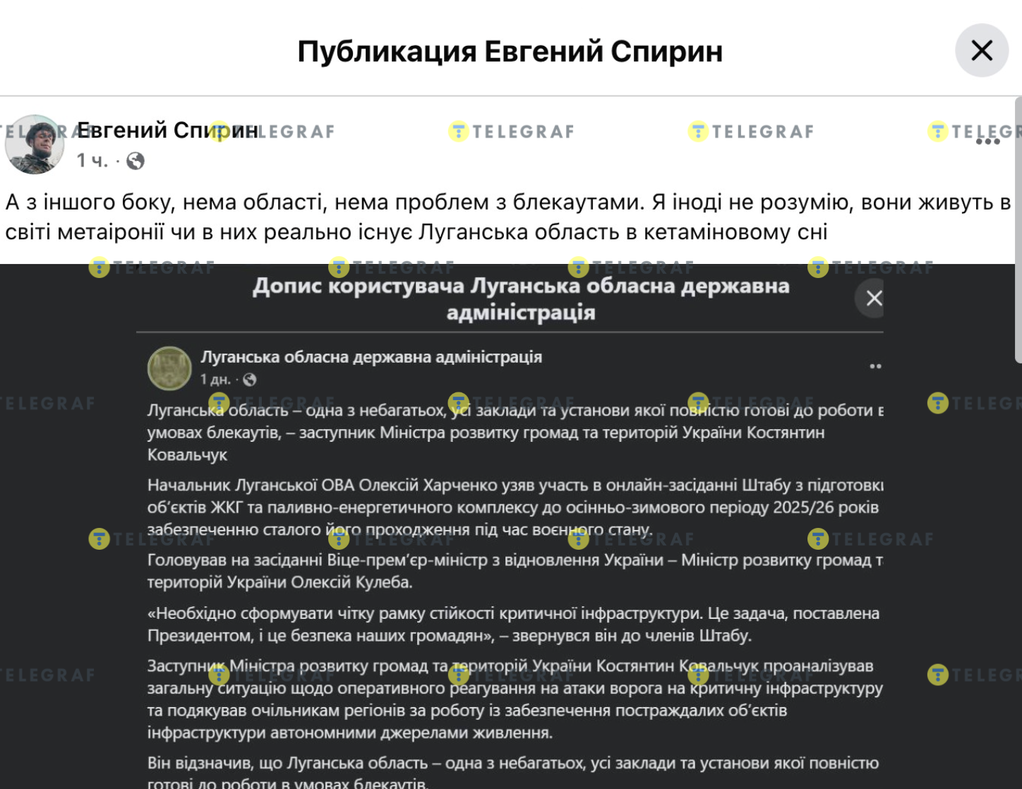 Як наголосив журналіст, блогер, військовий Євгеній Спірін: "А з іншого боку, нема області, нема проблем з блекаутами. Я іноді не розумію, вони живуть у світі метаіронії чи в них реально існує Луганська область в кетаміновому сні".