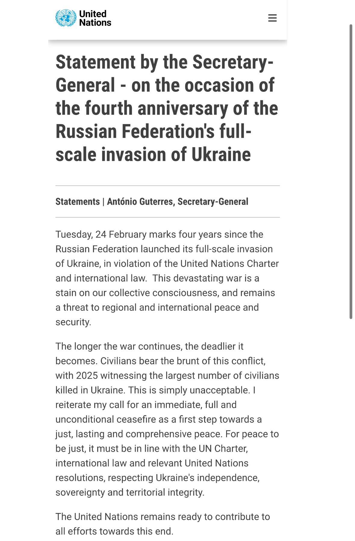 Генеральний секретар ООН Антоніу Гутерреш підтвердив принципову позицію щодо підтримки незалежності, суверенітету та територіальної цілісності України та чітко засудив повномасштабне вторгнення Росії, додав Сибіга.