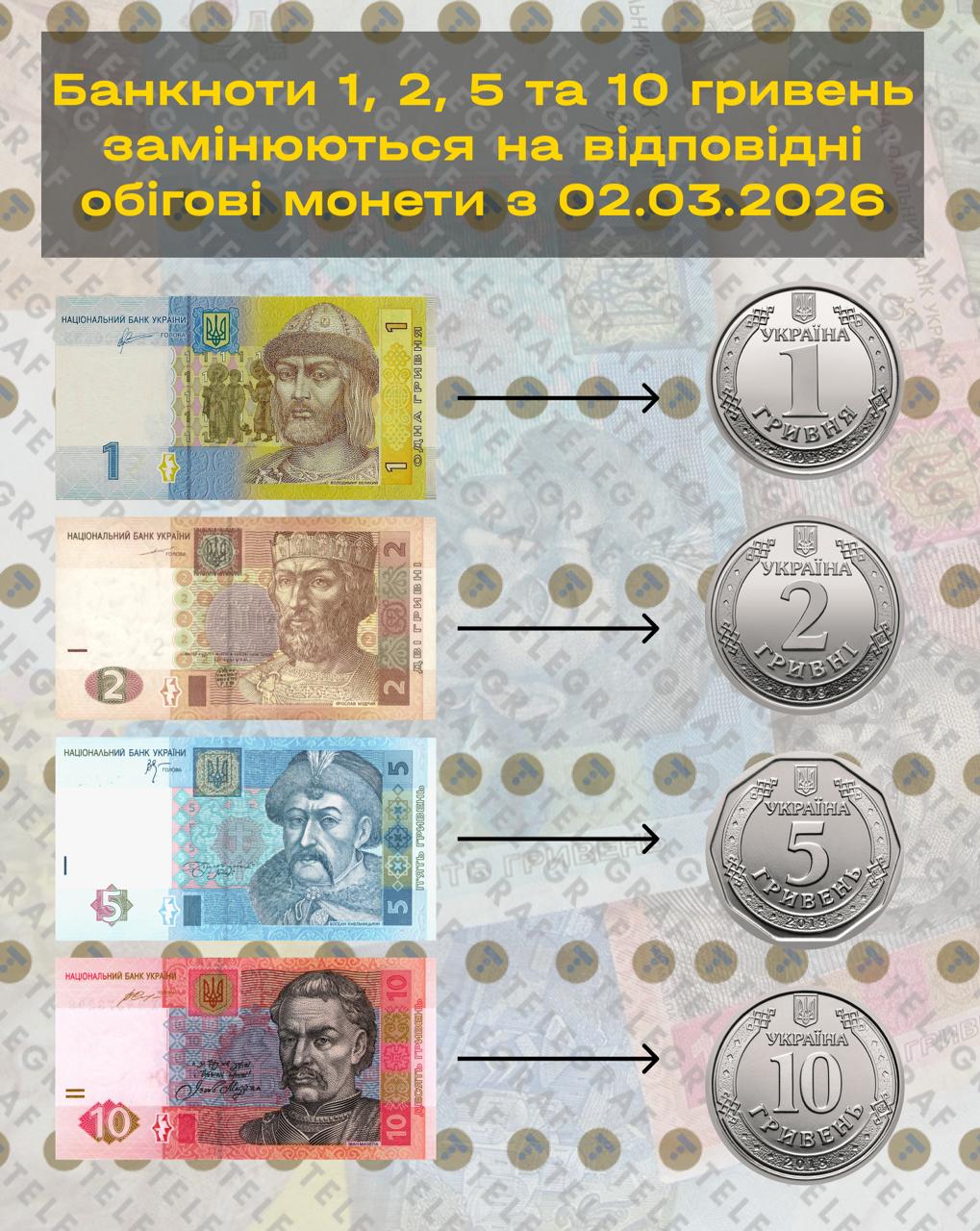 Нацбанк з 2 березня виводить з обігу купюри 1,2,5 та 10 гривень (зразки 2023-2027 років). Ними не можна буде розрахуватися, однак їх можна обміняти без обмежень у відділеннях банків до 26 лютого 2027 року. Замість них видають монети.