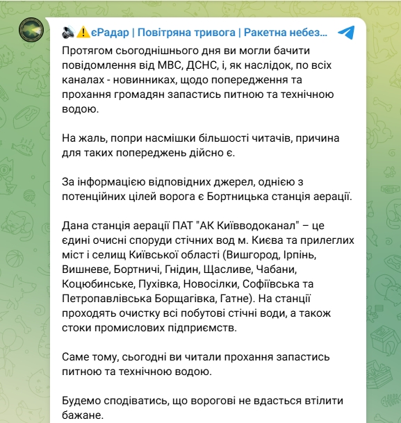 Починаючи з 11 лютого в Україні почала ширитись інформація про можливий російський обстріл об'єктів водопостачання та водовідведення. Повідомлялось навіть, що однією з потенційних цілей ворога є Бортницька станція аерації під Києвом.