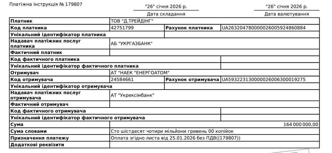 Щобільше, 26 січня "Енергоатом" отримав від компанії Ахметова 164 млн грн як добровільну компенсацію.
