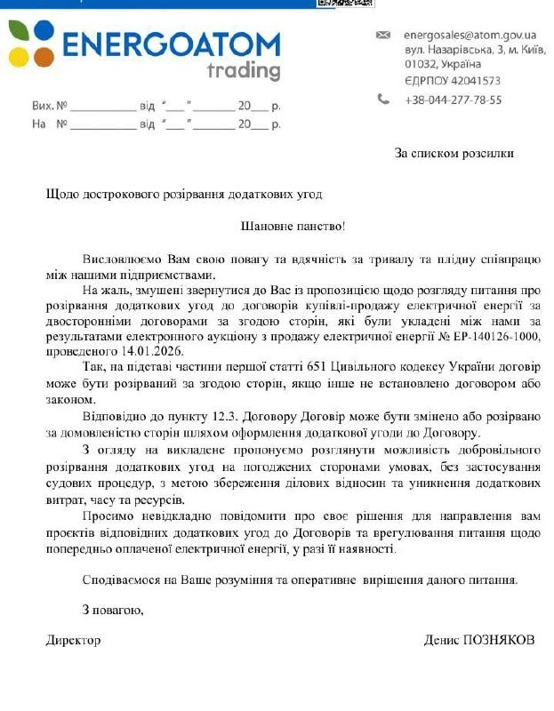 Вже після заяви "Д.Трейдінг" з’явилася явно вимушена реакція "Енергоатому". Ярослав Железняк опублікував у себе лист державної енергокомпанії до трейдерів, де вона "звертається із пропозицією" про розірвання на добровільній основі договорів, укладених за результатами аукціону 14 січня.