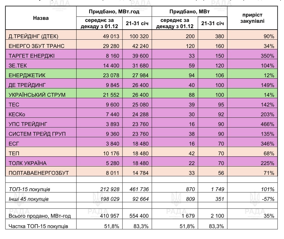"ТОП-15 компаній збільшили свої закупівлі на 101%, при чому інші 45 компаній зменшили свої закупівлі на 57%. А деякі компанії збільшили обсяги закупівлі аж у 3-4 рази. Така різниця у поведінці свідчить, що деякі великі компанії або заздалегідь знали про можливий перегляд прайс-кепів, або здогадувалися/розуміли, що таке можливо", — зазначає у своєму листі голова енергетичного комітету ВР.