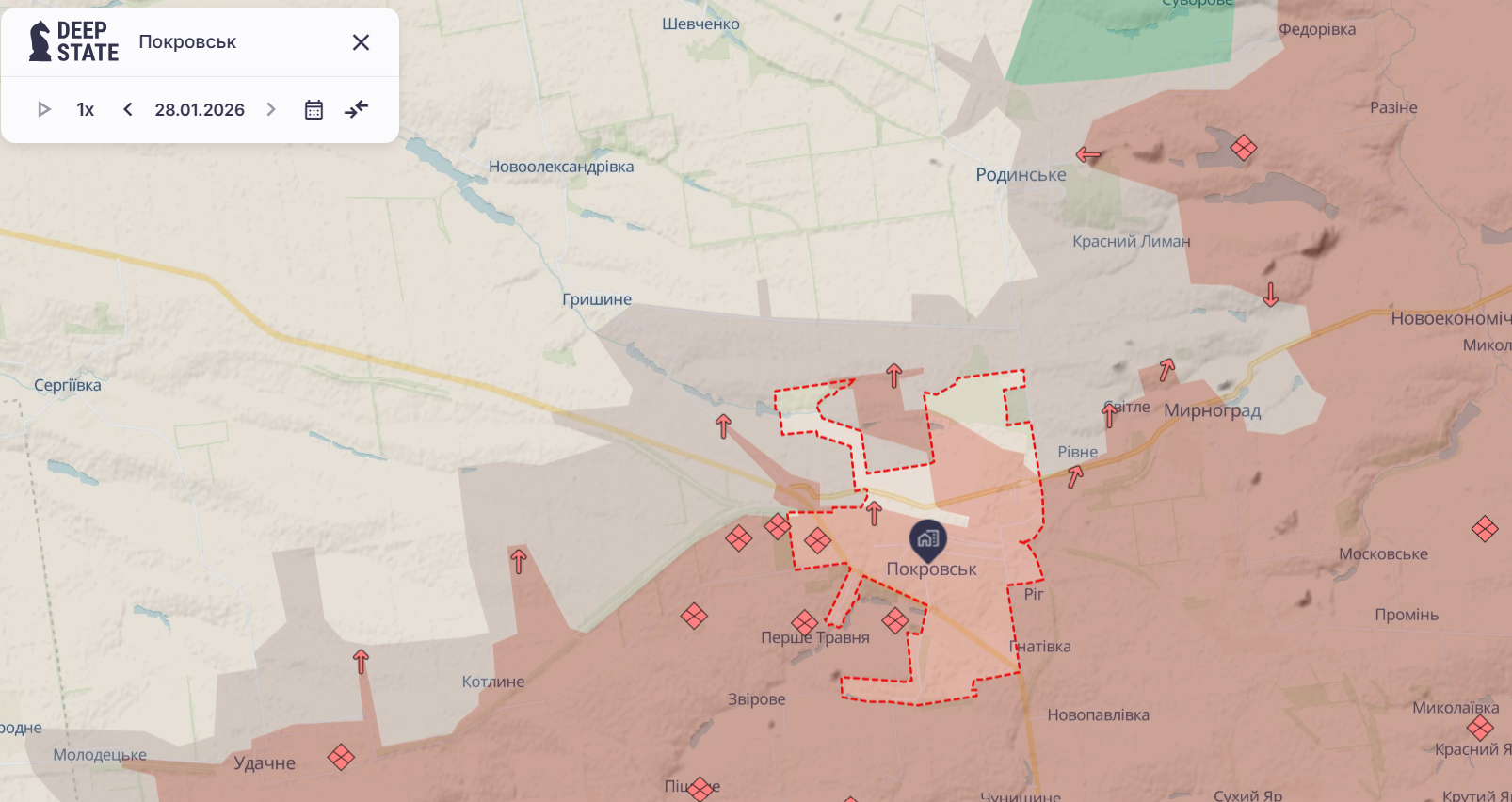 Інститут вивчення війни зафіксував просування українських військ у Покровську в останньому звіті. Бої у цьому місті тривають з жовтня 2025 року — Росія кинула на Покровський напрямок понад 140 тисяч солдатів, близько чверті своєї армії в Україні. Наприкінці листопада Кремль звітував про захоплення міста, але це спростували українські Сили оборони та незалежні спостерігачі.