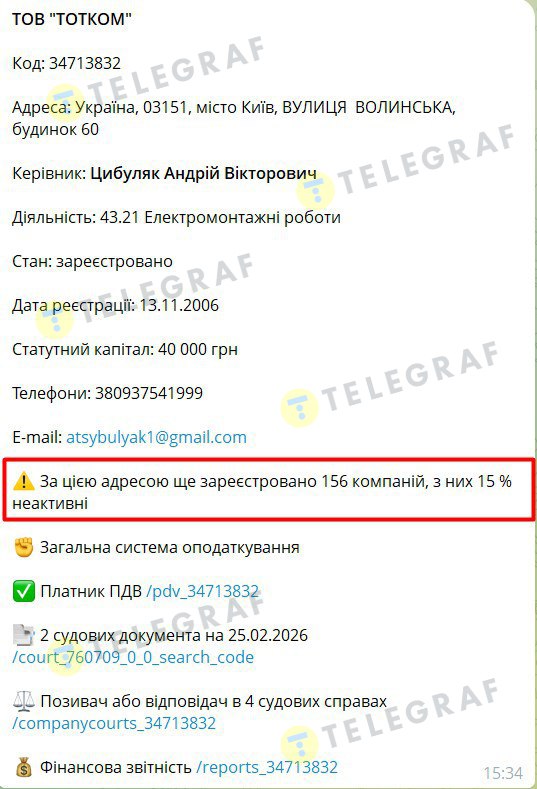 Місто реєстрації — будівля на вул. Волинській у Солом’янському районі Києва. На цій же адресі "сидять" десятки інших компаній: за даними Опендатабот — 156, а YouControl — 255.