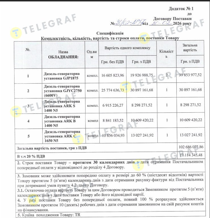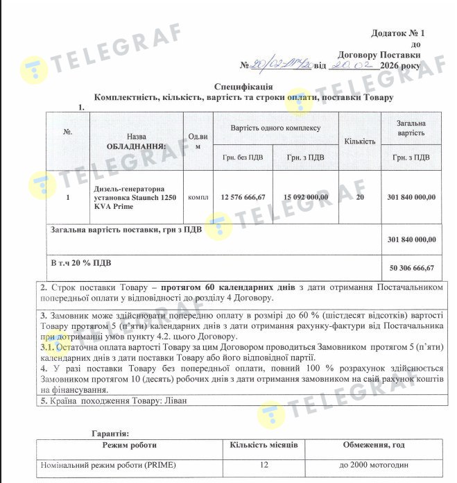 Цього разу ТОВка має виконати контракт у сотні разів дорожчий. За умовами договору йдеться про постачання 20 комплектів дизель-генераторних установок Staunch 1250 KVA Prime з двигуном Gummins. Тобто – дуже потужного обладнання, здатного забезпечити енергопостачання великих промислових об’єктів, житлових комплексів, лікарень або навіть цілих виробничих потужностей. Такі генератори через високі технічні характеристики майже відсутні у вільному продажу і зазвичай постачають під замовлення. Через це важко й порівняти ціни, запропоновані переможцем тендеру, а це понад 15 млн грн за одиницю, з ринковими.
