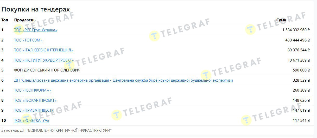 З огляду на критичну важливість генераторного обладнання в умовах постійних обстрілів, що призводять до тривалих відключень електроенергії, дивним виглядає вибір постачальника. Державне підприємство віддає підряди на сотні мільйонів маловідомій компанії без тендерного досвіду. ТОВ "Тотком" з початку 2026 року посідає друге місце серед переможців тенедерів ДП "Відновлення критичної інфраструктури". Більше з бюджету – 1,5 млрд. грн – отримає компанія "РСЕ Груп Україна"