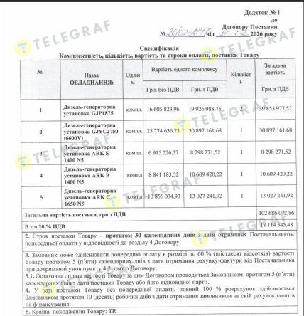 Така сама історія і з ще одним контрактом, що в ці дні має бути в роботі у ТОВ "Тотком". Адже укладений 16 лютого з терміном виконання – до 5 березня. Вартість угоди 25,9 млн грн. На цю суму компанія має забезпечити постачання двох комплектів: генераторної установки моделі TD-1250 BDS, що має потужність 1250 кВт та є оптимальною для середніх об’єктів та TD-1380 PS з більшою потужністю і здатністю забепечувати роботу великих промислових підприємств та енергетичних проектів. Закупати установки компанія планує на теренах України.
