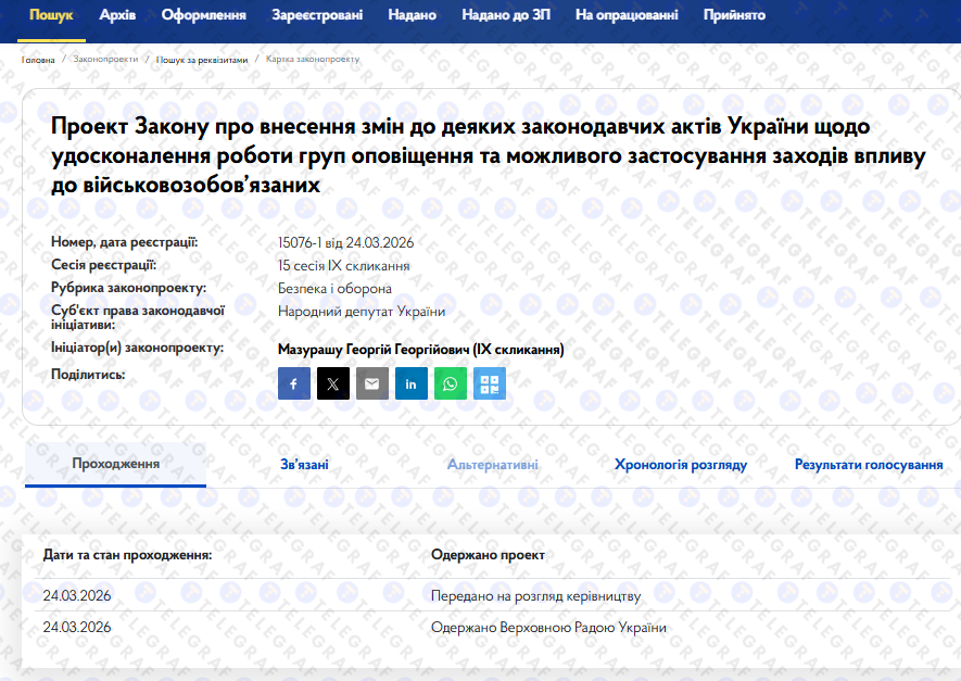 Проект зареєстрований 24 березня 2026 року та буде розглянутий на 15-й сесії IX скликання Верховної Ради.