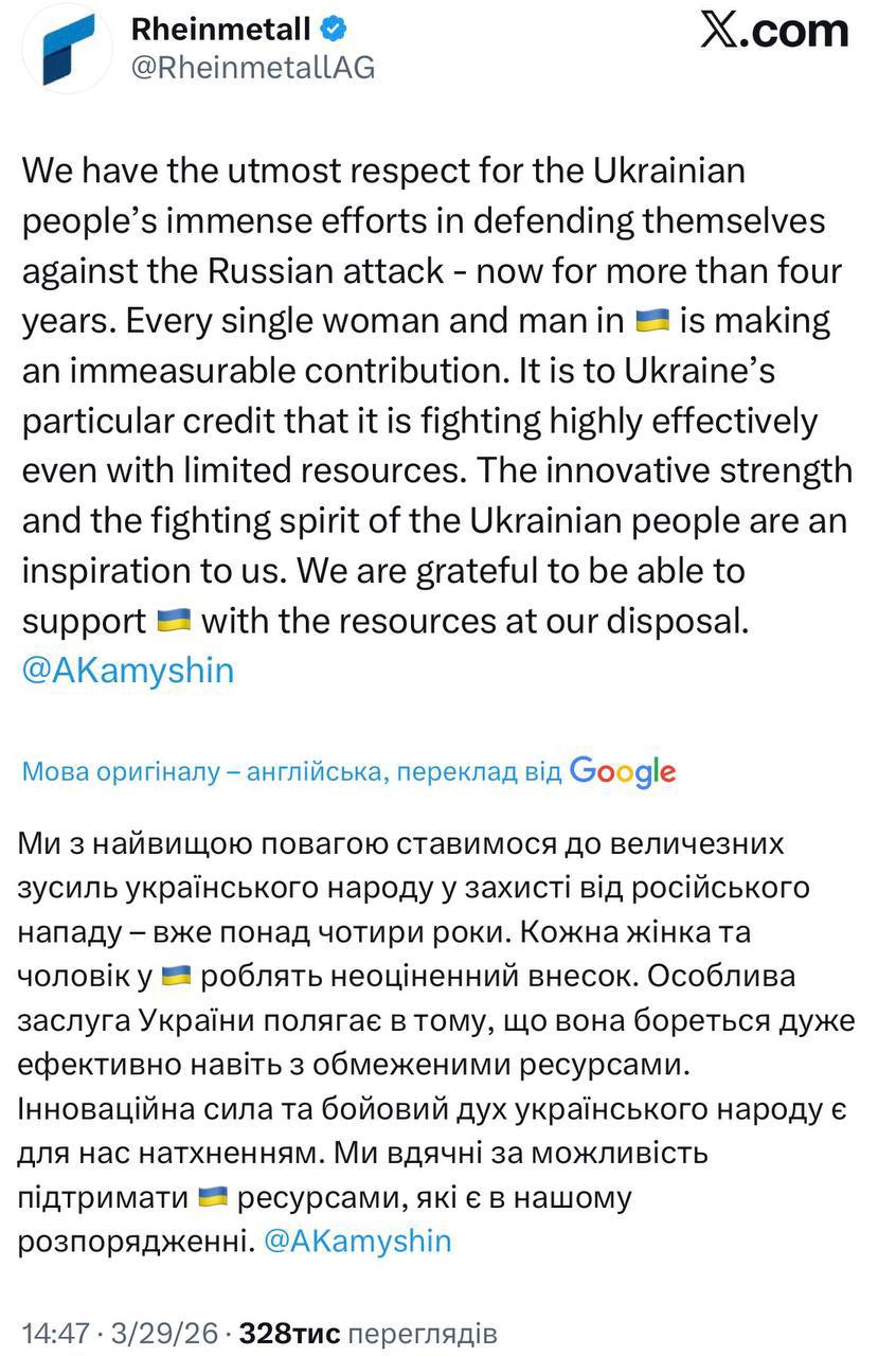У неділю, 29 березня, у Rheinmetall назвали українські дрони "грою в Legо" та "роботою домогосподарок". Однак після гучної заяви пізніше з’явилися вибачення.