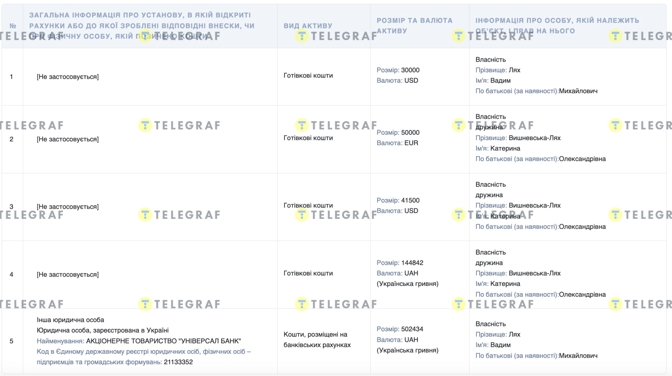 Виходить, що зарплата Ляха щороку змінювалась, у 2024 її чомусь знизили, а у 2025 підвищили майже в три рази. До слова, заощадження подружжя має немалі: готівкою у чоловіка 30 000 доларів, на банківському рахунку 502 434 грн; у дружини — 50 000 доларів, 41 500 євро, 144 842 грн.