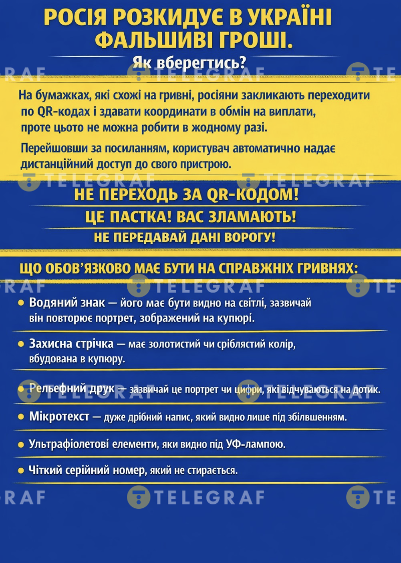 На цих бумажках, які схожі на гривні, росіяни закликають переходити по QR-кодах і здавати координати в обмін на виплати, проте цього не можна робити в жодному разі. Перейшовши за посиланням, користувач автоматично надає дистанційний доступ до свого пристрою. Окрім того, на "купюрах" є досить провокативні написи, аби підбурити суспільство: