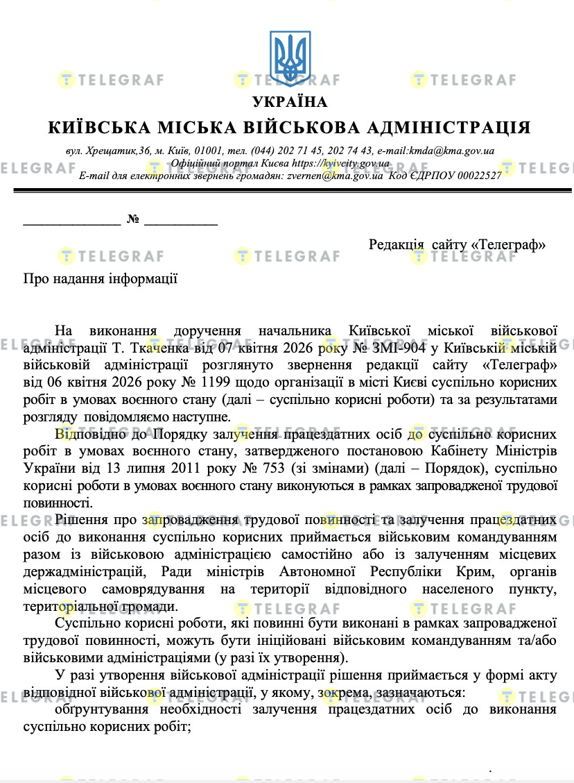 Про це "Телеграфу" повідомили у Київській міській військовій адміністрації (КМВА). У відповіді на запит видання зазначено, що суспільно корисні роботи в умовах воєнного стану виконуються в рамках запровадженої трудової повинності.
