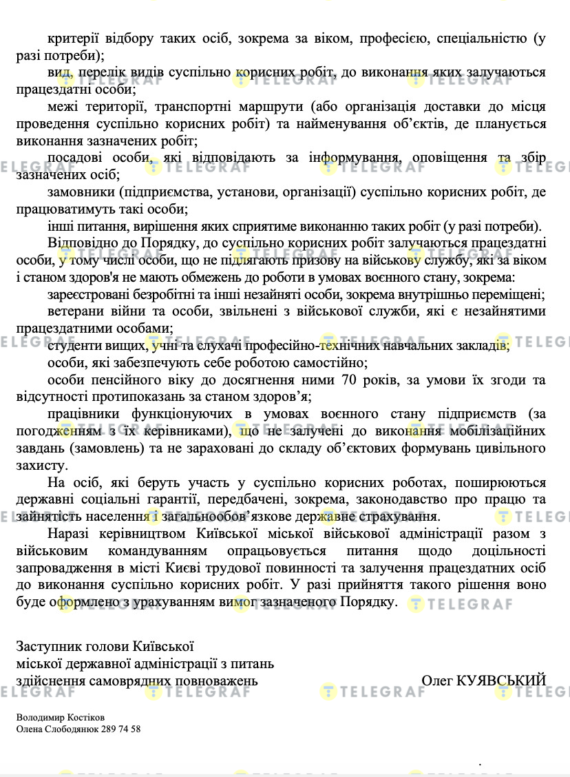 "Наразі керівництвом Київської міської військової адміністрації разом з військовим командуванням опрацьовується питання щодо доцільності запровадження в місті Києві трудової повинності та залучення працездатних осіб до виконання суспільно корисних робіт", — йдеться у документі.