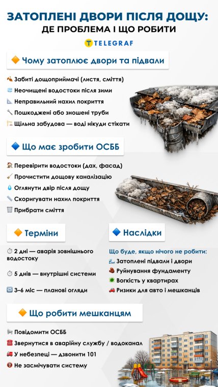 "Телеграф" з’ясував, хто відповідає за дощову систему кожної будівлі, які обов’язки має ОСББ або управляюча компанія і які наслідки можливі, якщо їх ігнорувати.
