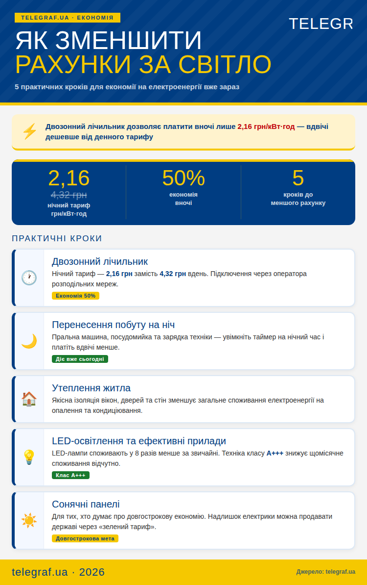 - Двозонний лічильник — нічний тариф 2,16 грн замість 4,32 грн;