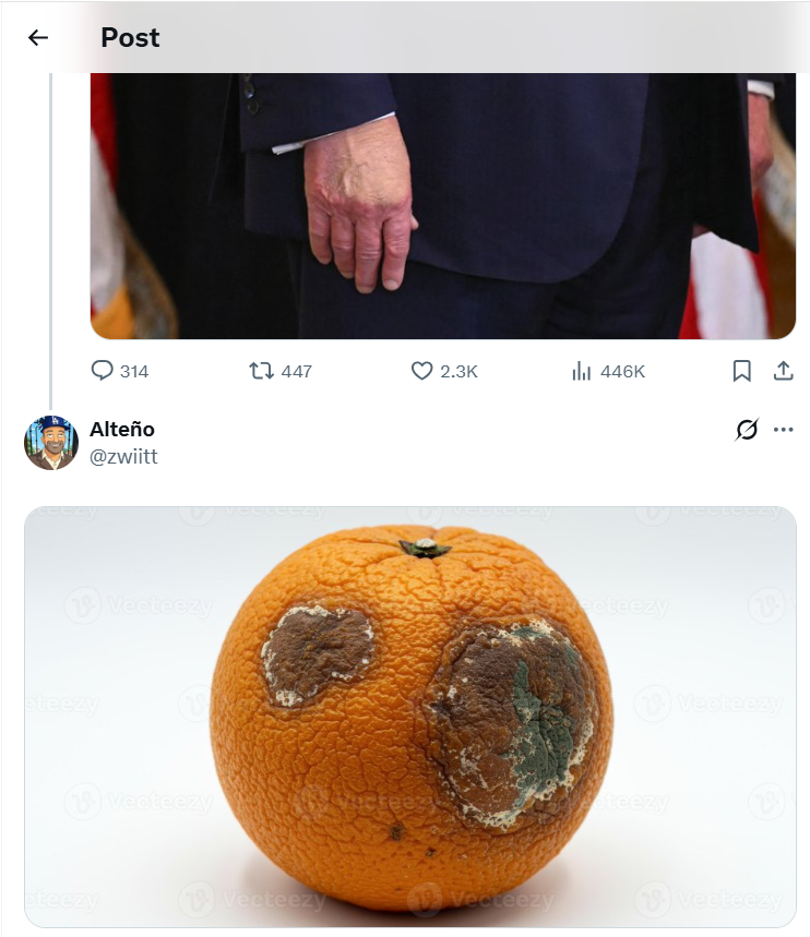 А один з користувачів просто прикріпив фотографію гнилого апельсина, порівнявши його з президентом, який, на думку інших користувачів, "гниє зсередини".