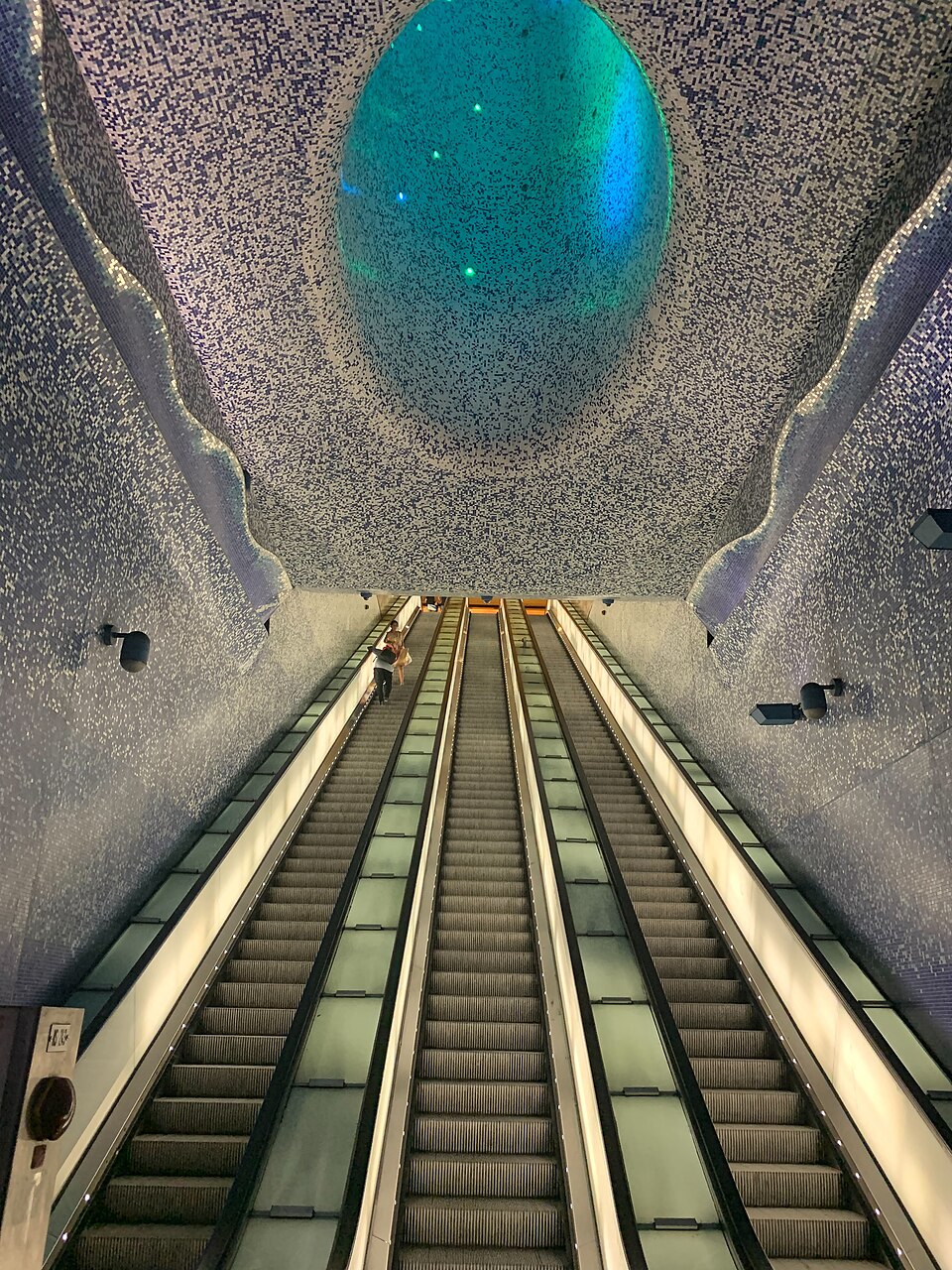 Футуристичні елементи, світлові панелі та виразна гра контрастів перетворюють спуск у метро на справжнє естетичне враження, а не просто транспортну операцію.