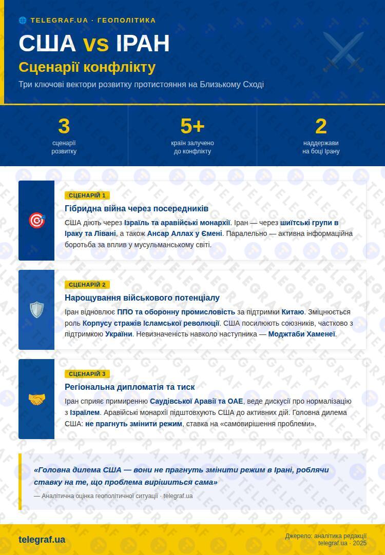 - Сторони перейдуть до гібридних форм ведення воєнно-політичного конфлікту : "випадкові" та "нерегулярні" застосування засобів повітряного нападу через треті сторони. Наприклад, із боку США – Ізраїль, аравійські монархії. З боку Ірану – шиїтські угруповання в Іраку, шиїтські угруповання в Лівані, Ансар Аллах (Зейдітскій рух) в Ємені. При цьому і Вашингтон, і Тегеран працюватимуть над відбілюванням себе та своїх партнерів в очах мусульманського світу. США – у контексті співпраці з Ізраїлем та бомбардування шиїтського Ірану, а останній – у контексті ударів по сунітських аравійських монархіях.